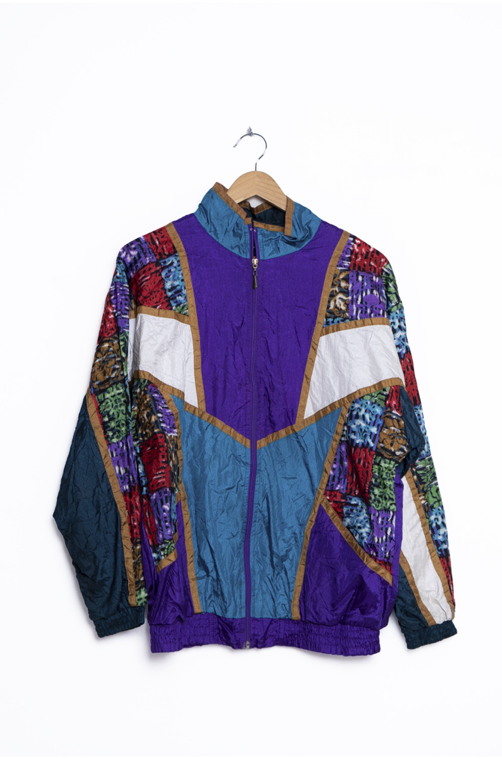 Crazy Jacket lila con estampado celeste, rojo, blanco, etc. Talla M-L.